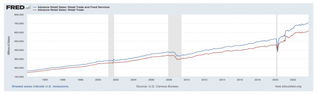 That $705B Oct. 2023 number can be put into a much longer context too. Consult a Fed of St. Louis (FRED) 30-year timeline, shown below. The blue line (below) is Advance Retail Trade and Food Services. The red line is just the Retail Trade numbers.