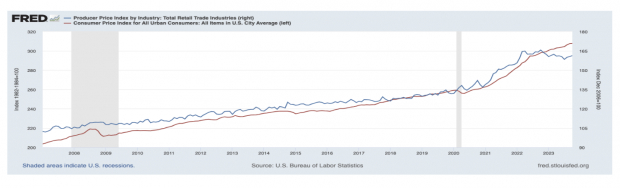 In the next chart, I show any budding retail spending analysts the Total Retail Trade Industries Producer Price Index against the CPI for All Urban Consumers.